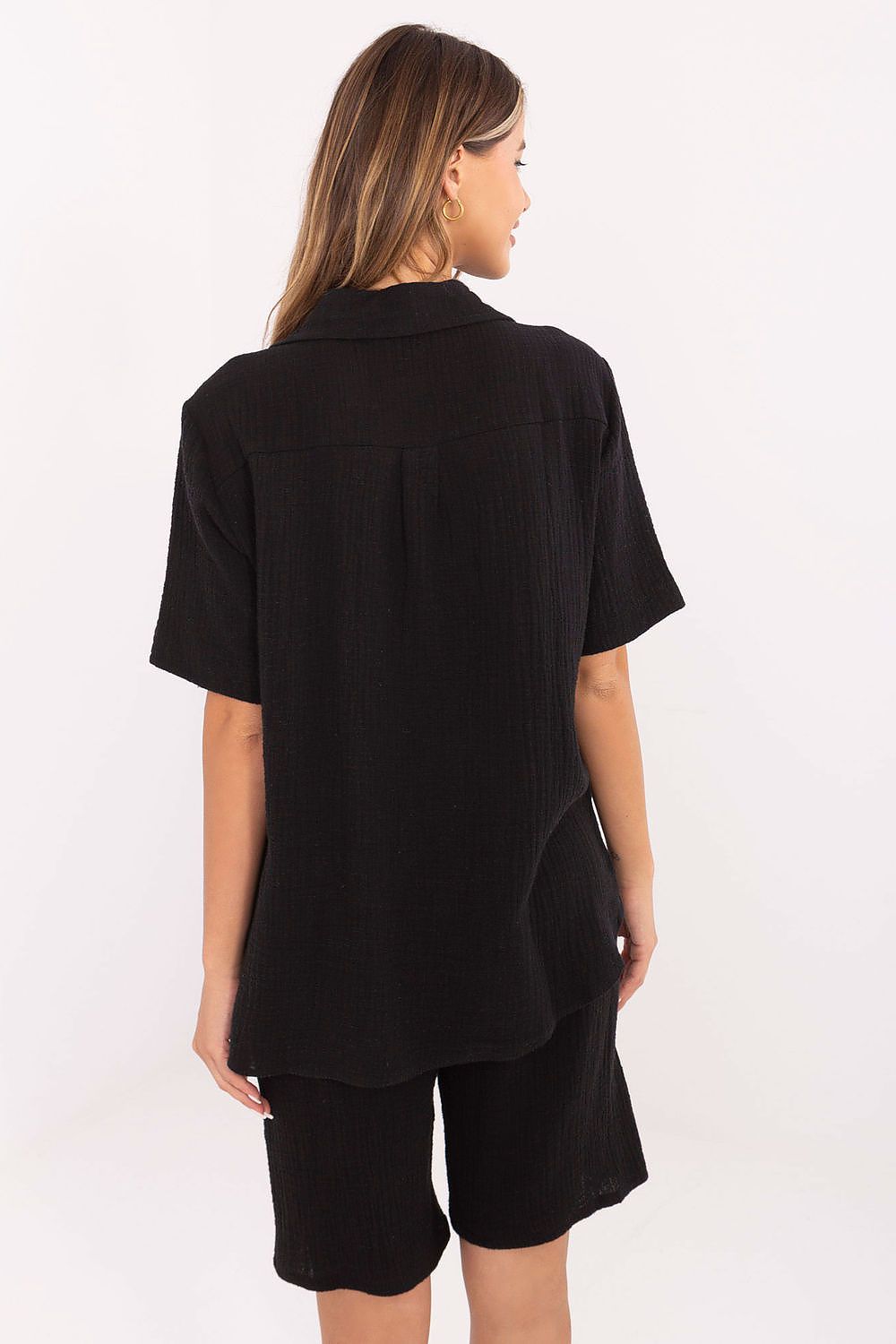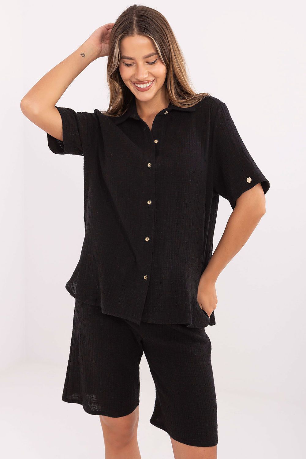 A light muslin set consisting of a shirt and shorts is an ideal proposal for warm, everyday days. Made of pleasant to the touch, breathable cotton, it provides maximum comfort and freedom of movement. The smooth material emphasizes the minimalist, casual style of the set. The short-sleeved shirt with a collar and button fastening looks elegant and modern, and an additional tie belt allows you to emphasize the waist and give the silhouette a feminine shape. Shorts with straight legs and a high waist have practical, side slip pockets. The set will work great for everyday wear, for a walk, shopping, or meeting friends.